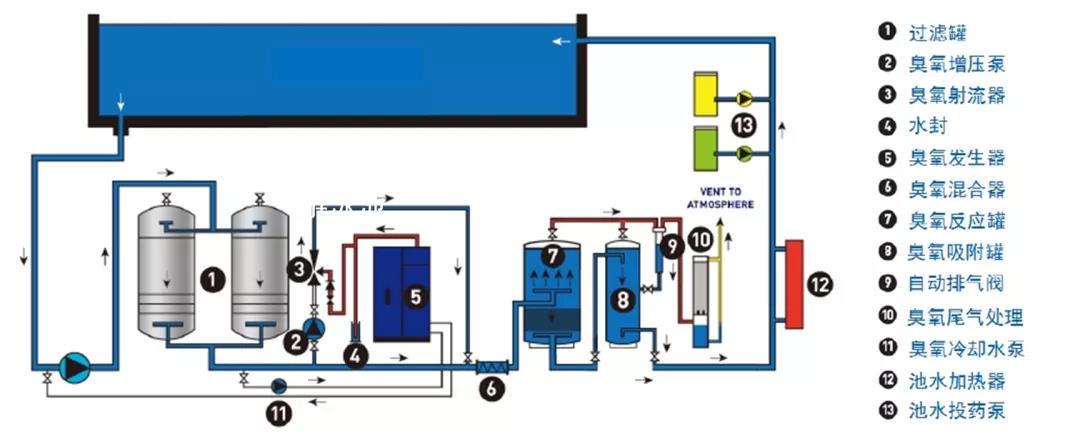 為了減少投氯,解決“砂”作為濾料時(shí)過濾精度不夠、導(dǎo)致大量細(xì)菌繁殖的問題,需采用“臭氧消毒”,利用臭氧的強(qiáng)氧能力進(jìn)行殺菌,同時(shí)利用臭氧的絮凝作用,讓水質(zhì)更清澈。