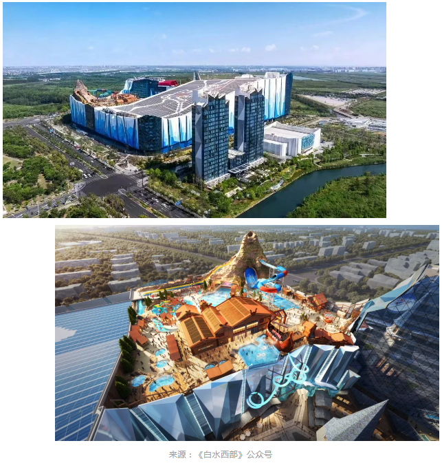 室外區(qū)域的“冰火峽谷”占地12,000平方米,作為目前中國(guó)內(nèi)地唯一在建筑體屋頂建造而成的室外水上樂(lè)園,預(yù)計(jì)明年夏日正式開放。